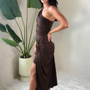 Chocolate One Shoulder Knot Skirt Midi Dress. Featuring our premium